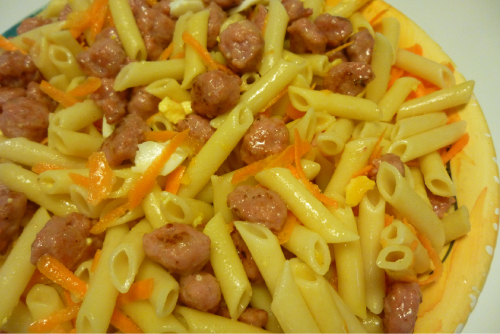En una fuente amplia, volcamos la pasta enfriada y bien escurrida.