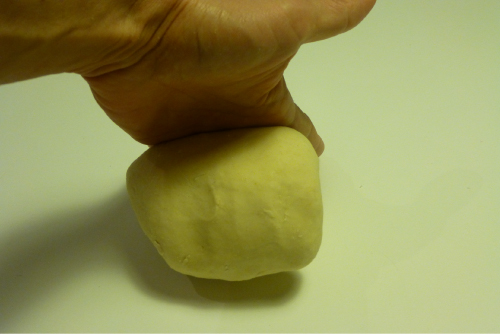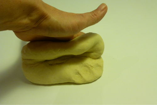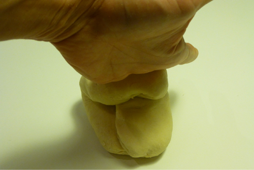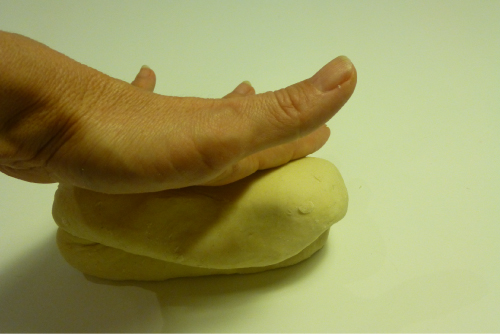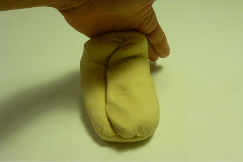 Seguimos amasando. Los movimientos son como las mujeres que antiguamente iban a lavar al río: enrollar de fuera hacia adentro, estirar de dentro hacia afuera, enrollar, girar, volver a estirar…. Así hasta que obtengamos una masa elástica, como si fuera plastilina.