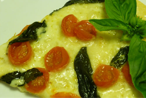 Repartir sobre la base los tomatitos partidos por la mitad, la mozzarella troceada (podéis hacerlo con los dedos) y las hojas de albahaca.