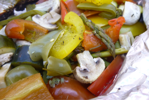 Colocar sobre la barbacoa o sobre una fuente de horno y cocinar durante unos 20-25 minutos, en función de si las verduras nos gustan más o menos al dente.
